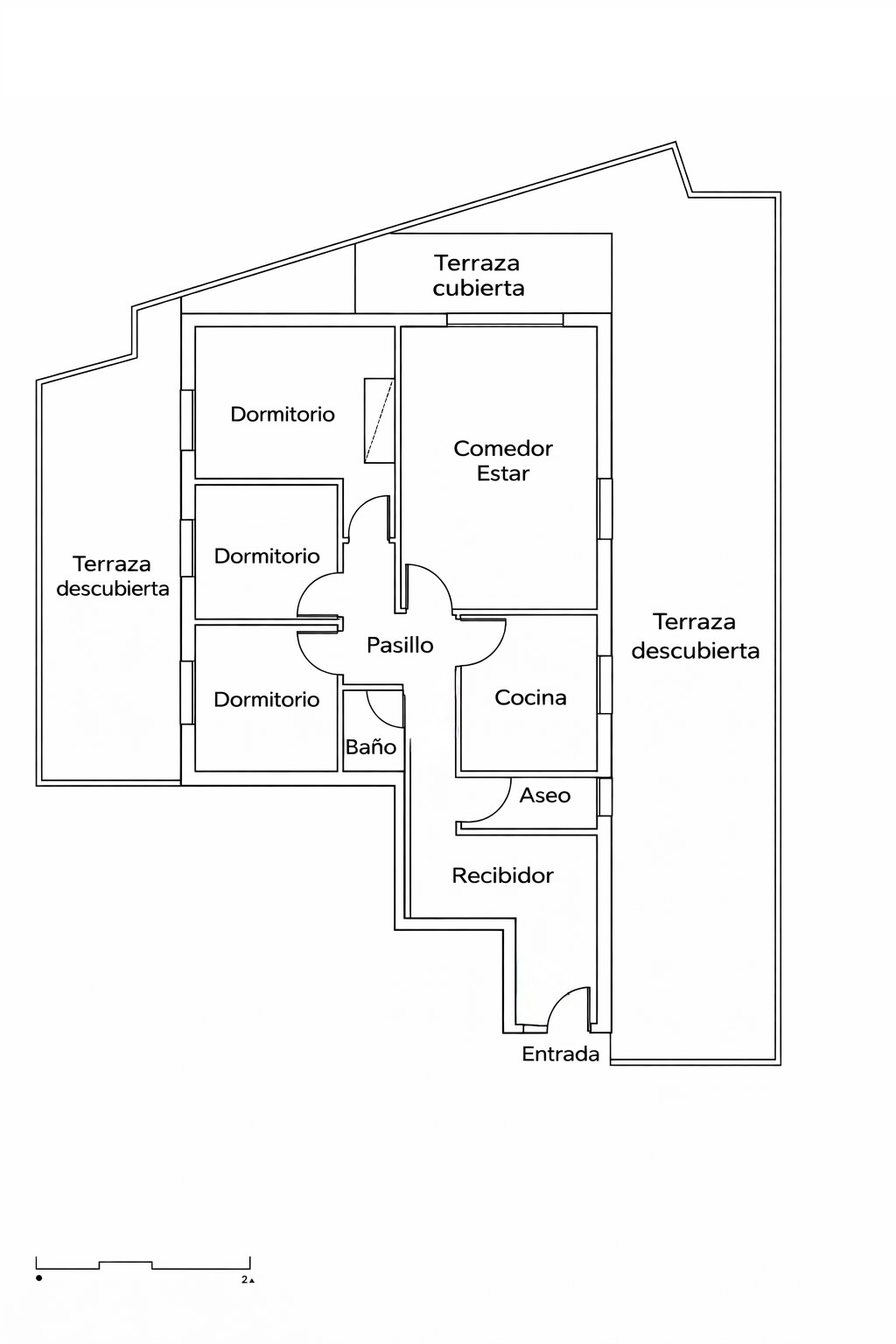 L’habitatge, situat en una primera planta en ple centre de L’Escala, disposa de 73 m² útils distribuïts en rebedor, sala d’estar-menjador, cuina independent, passadís, tres dormitoris i un bany. El veritable privilegi el proporcionen els seus espais exteriors: una terrassa coberta de 13 m², ideal com a menjador d’estiu o zona de relax, i una impressionant terrassa descoberta de 90 m² orientada al sud, que garanteix sol i llum natural durant tot el dia. Un espai únic per crear una zona chill-out, gaudir de reunions a l’aire lliure o simplement contemplar els capvespres mediterranis.