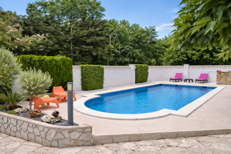 - A la primera baixa i principal de la vivenda, us seduirà un ampli i lluminós saló, molta claretat degut a la llum natural i gràcies als seus grans finestrals que donen a les terrasses. L’espai de vida s’obre harmoniosament cap a l’exterior, oferint un accés directe a una magnífica piscina privada de 50 m², perfecta per gaudir dels dies assolellats. El menjador, espaiós i acollidor, es troba al costat d’una cuina moderna i totalment equipada. També hi trobareu una suite principal amb bany privat, dues habitacions dobles, un bany amb dutxa i un lavabo de cortesia.
